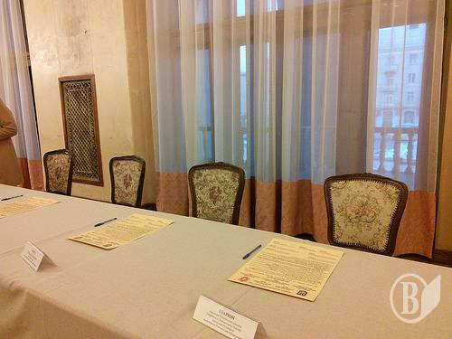 Меморандум про єдину Україну та єдину Українську помісну православну церкву мали підписати о 15-й, проте представники релігійних конфесій не підіймалися — на першому поверсі драмтеатру вони ще дискутували та узгоджували текст Меморандуму. Як виявилося, півтори години їм знадобилося, аби включити у текст п’ятий пункт та роздрукувати новий текст.