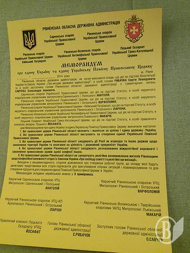Меморандум підписали керуючий Сарненською єпархією УПЦ митрополит Сарненський та Поліський Анатолій, керуючий Рівненською єпархією УПЦ митрополит Рівненський та Острозький Варфоломій, керуючий Рівненською єпархією УПЦ-КП митрополит Рівненський та Острозький Іларіон, керуючий Рівненсько-Волинською та Таврійською єпархіями УАПЦ митрополит Львівський Макарій, правлячий єпископ Луцького екзархату УГКЦ Йосафат, голова Рівненської ОДА Сергій Рибачок та його заступник Олександр Савчук.