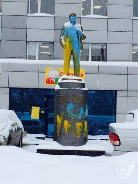 На памятнике В.И. Ленину, установленному возле главной проходной бывшего Чебоксарского хлопчатобумажного комбината, появился украинский флаг.