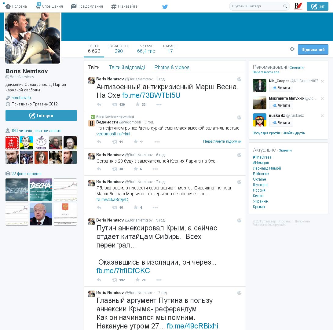 Нагадаємо, 10 лютого в інтерв'ю "Собеседнику" Борис Нємцов заявив: "Боюсь того, что Путин меня убьет":