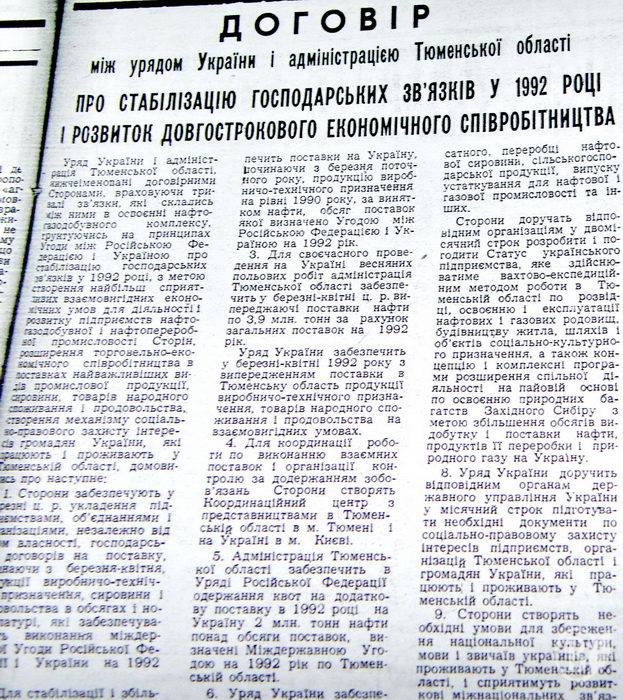 І тоді Вітольд Фокін 3 березня 1992р. полетів до нафтовиків Тюмені, багато з яких були з України і працювали там вахтовим методом. Він домовився з керівництвом області про обмін нафтосировини і пального на продукти харчового виробництва і товари народного споживання. Було підписано «Договір між урядом України і адміністрацією Тюменської області».