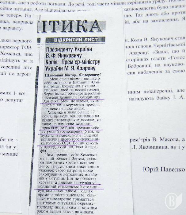 Відставки не тільки першого прем’єр-міністра прагнув Л. Г. Яковишин. Коли В. Янукович став президентом, то гендиректор ТОВ «Земля і воля» почав добиватися звільнення голови Чернігівської ОДА Володимира Хоменка, писав відкриті листи президенту, копії М. Азарову: