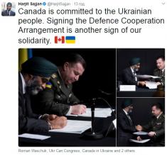 Підписано Домовленість про оборонне співробітництво між Канадою і Україною. У церемонії в понеділок, 3 квітня, взяли участь Harjit Sajjan та Степан Полторак.