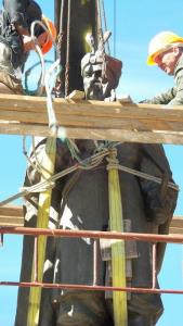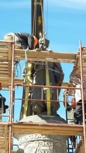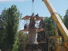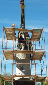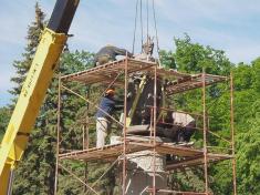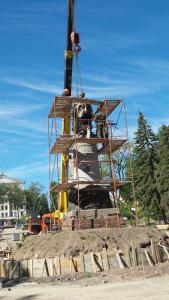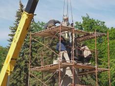 Людина без засобів індивідуального захисту голіруч лізе вигрибати камінчики з-під багатотонного підвішеного пам'ятника.