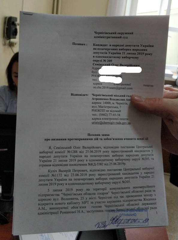 Кандидат по округу №205 від "Слуги народу" Олег Семінський подав позов на міського голову Чернігова Владислава Атрошенка до Чернігівського окружного адміністративного суду щодо "незаконної" на думку кандидата агітації "за одного з кандидатів по 205-му округу м. Чернігова".