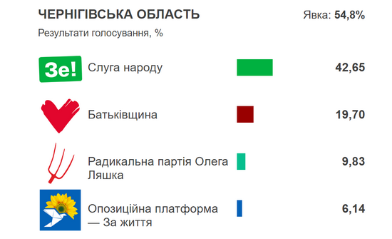 На Чернігівщині найвища явка на виборах по Україні - 54,80%. Лідери - Слуга, Батьківщина і Ляшко