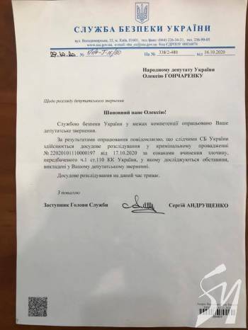 Про це повідомив народний депутат із фракції "Європейська солідарність" Олексій Гончаренко у Фейсбуці, виклавши фото відповіді СБУ на його депутатський запит з цього приводу, передає Укрінформ.