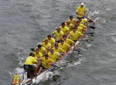 Двадцять гребців у вузькому човні ритмічно веслують. Серед них – один барабанник, який задає ритм, і рульовий. Перед човна прикрашений головою дракону. Про цей вид спорту і перемоги своєї команди розповідає учасник змагань, студент факультету фізичного виховання ЧДПУ ім. Шевченка Сергій Дікалов.