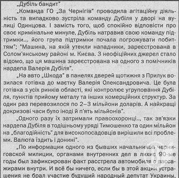 - Інформація, яку розповсюджував Глаба у Чернігові проти Валерія Дубіля під час виборчих перегонів минулого року – це суцільний наклеп. Це підтвердив суд трьох інстанцій, - прокоментував помічник-консультант народного депутата В. Дубіля Микола Миргородський. – Ми задоволені таким рішенням. Це вкотре доводить, що в нашій країні працює Конституція, що кожна людина має право захистити честь, гідність і ділову репутацію. І Валерій Дубіль і його команда абсолютно нормально сприймають обгрунтовану критику, бо вона ознака цивілізованого суспільства. Одразу після виборів Валерій Дубіль публічно заявив про те, що не тримає образи на людей, які поливали його брудом. Та покласти край цим звинуваченням мав суд, аби це стало наукою для людей, для яких подібні методи стали нормою життя.