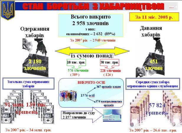Об уровне коррумпированности говорит и общая сумма полученных должностными лицами взяток - свыше 91,1 млн. грн., тогда как в прошлом году эта цифра была почти втрое меньшей - 34 млн. грн.