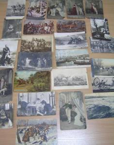Почтовые карточки имеют историческое направление: «Встреча разъезда французких гусаров с русской пехотной заставой накануне Бородинского боя (война 1812)», «Прощание пленника. 1583» и другие. На цветных картинках, напечатанных в начале прошлого века, изображения птиц.