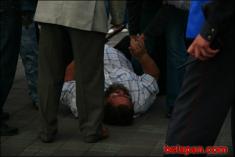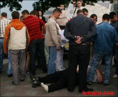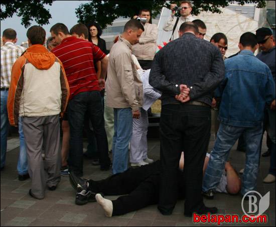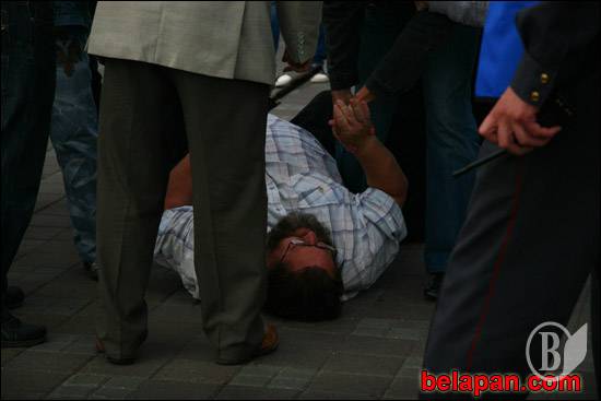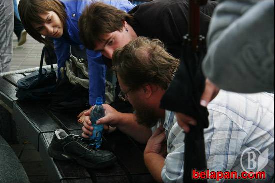 Люди почали кричати «викличте швидку!», хтось намагався зробити це самостійно за допомогою мобільного. Але невідомі в цивільному обступили хворого, для чогось намагалися підняти його з асфальту і кудись тягти. Інші в цей час затримували перебуваючих в цьому місці людей, у тому числі учасників акції.