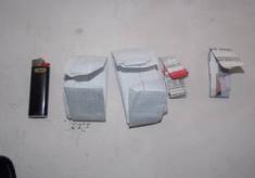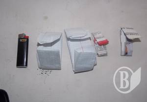 За результатами проведення його особистого огляду в задній кишені брюк, у шкарпетці на правій нозі та під натільною білизною виявлено чотири пакунки з речовиною темно-коричневого кольору (попередньо марихуана) загальною вагою