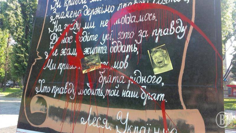 Неизвестные разрисовали красной краской постамент, где раньше стоял Ленин. По похожему сценарию вандалы испортили патриотический забор в районе магазина «Электрон».