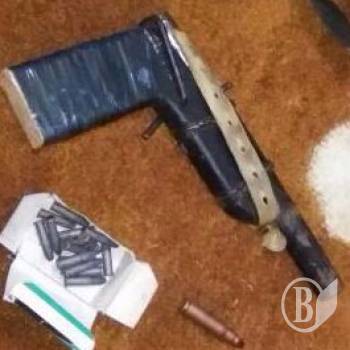 На додачу, як бачимо на фото, підозрюваний володів жахливим (принаймні, на вигляд) «самопалом» – це саморобний пристрій для стрільби бойовими патронами та набої до нього.
