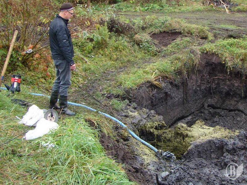 Хвилин через 30 після розмови з сільським головою я виїхав перевірити, що ж там коїться і чи зупинилися роботи. Приїхавши на місце, помітив працюючий екскаватор та вантажний автомобіль і кілька легкових припаркованих поряд. Одна людина керувала роботою, інша возилася з помпою для відкачування води.