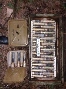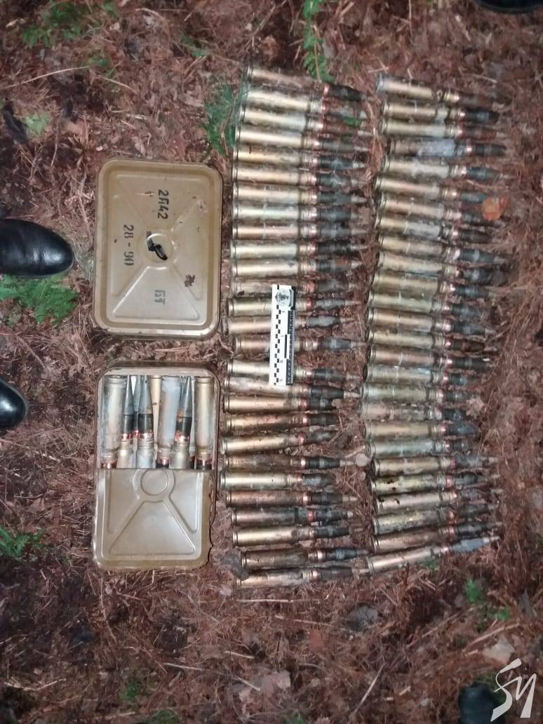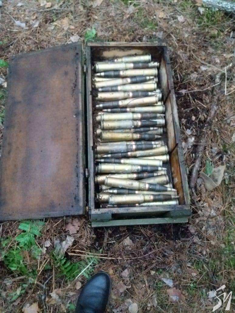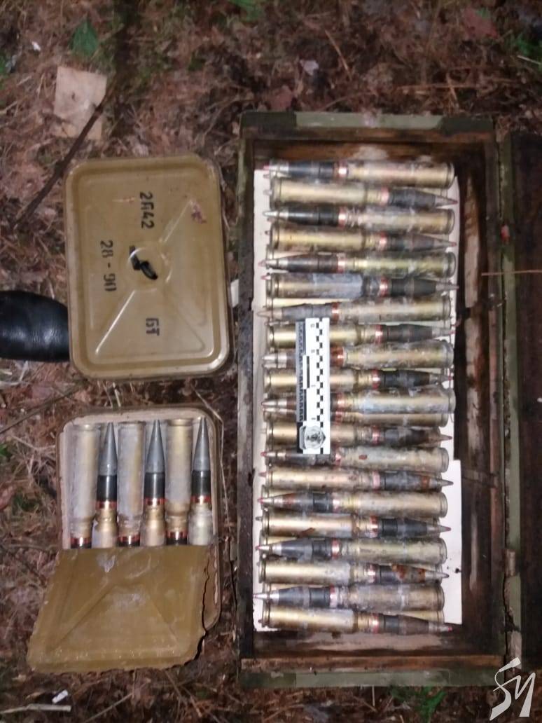 Схрон був облаштований у лісі поблизу однієї з військових частин, що дислокується не території регіону. Зі схованки правоохоронці вилучили майже сто патронів до артилерійських гармат калібру 30 мм, які встановлюються на бойових машинах, і призначені для враження броньованих цілей.