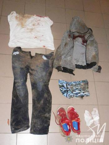 Був одягнений: футболка білого кольору, труси-боксери камуфльовані в синьо-біло-чорні плями, кофта на блискавці з капюшоном блакитного кольору, джинси синього кольору, кросівки червоного кольору на підошві білого кольору, шкарпетки білого кольору.