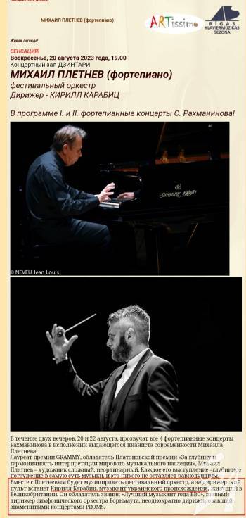 Саме таким чином презентують Кирила Карабиця на фестивалі "Artissimo" , де він через 11 днів виконає разом з російським піаністом Міхаілом Плєтньовим 4 концерти Рахманінова в честь 150-річчя російського композитора. "Музикант українського походження" не в перший раз охоче погоджується на колаборації з росіянами та на виконання російської музики. На цей раз і фонд, який організовує фестиваль підтримується російською федерацією.