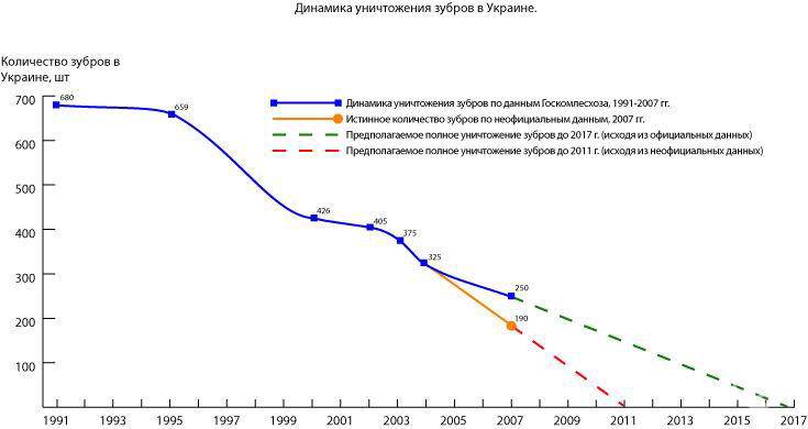 P. S. В 1992 г. в Даневском охотничьем хозяйстве Черниговской обл. обитало 120 зубров - одна из наибольших субпопуляций в Украине. Весной 2007 года погибли последние 7 животных. В 1998 г. в Чернобыльскую зону отчуждения вместе с конями Пржевальского завезли пару зубров. Один погиб почти сразу в результате травмы, другой – в конце 2000 года в результате безответственного отношения.