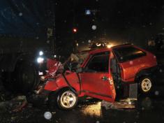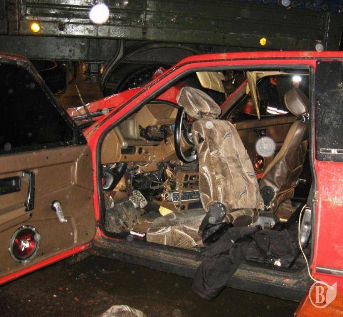 Перед легковика сильно помялся. Водитель и двое пассажиров получили телесные повреждения и не могли выйти через заблокированные двери.