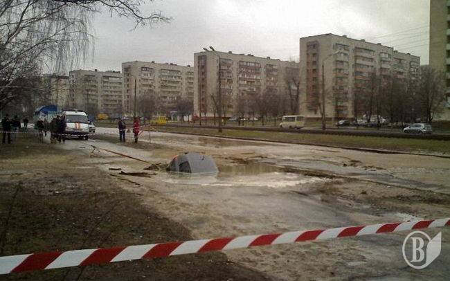 На Борщаговке, неподалёку от перекрёстка улиц Симиренко и Булгакова провалился под землю автомобиль.
