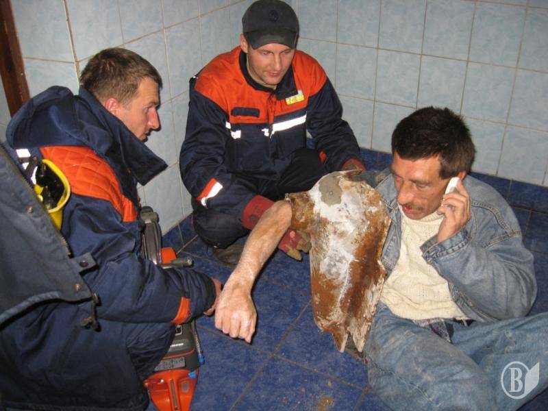 Когда все же спасатели выдолбили унитаз и отрезали часть сливной трубы, то появился вопрос, как снять это сантехническое изделие с руки человека.