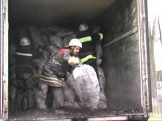 На место происшествия сразу же выехала часть спецтехники. Спасатели открыли прицеп и начали вытягивать мешки с углем и поливать их водой.