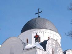 Два дня строители-альпинисты работали на Спасо-Преображенском и Борисоглебском соборах, очищали самые древние памятки архитектуры от зимнего покрова.