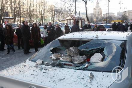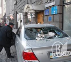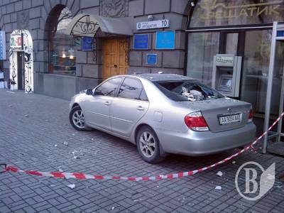 От здания на Крещатике отпал кусок барельефа и повредил автомобиль, припаркованный на тротуаре.