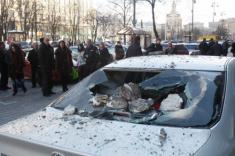 Барельеф упал на автомобиль «Тойота Камри», который был припаркован непосредственно у этого дома, в результате чего разбит люк на крыше авто, заднее стекло и повреждено кузов в нескольких местах.