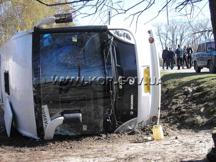 Водій автобуса «Scania», рухаючись в напрямку Києва, не вибрав безпечної швидкості руху, не впорався з керуванням, з'їхав в правий кювет та перекинувся на правий бік.