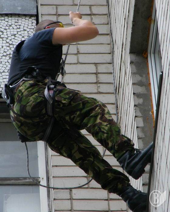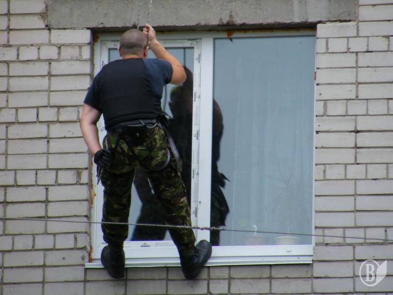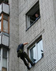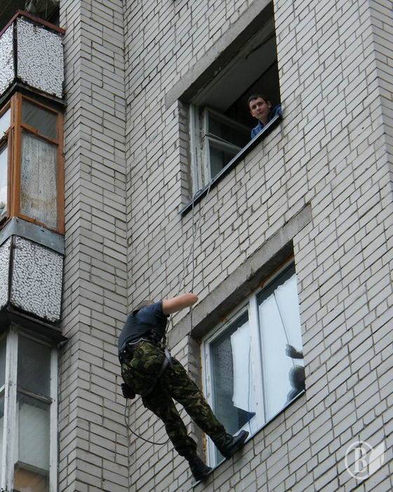 Ближче до закінчення дійства, о пів на 18 годину, через зачинене вікно вів переговори «людина-павук», звісившись з вікна п’ятого поверху. Рятувальник вмовляв неадеквата кинути ніж, відчинити двері, відчинити вікно, навіть запрошував... на пиво.