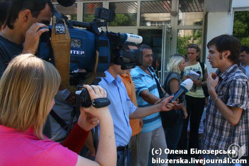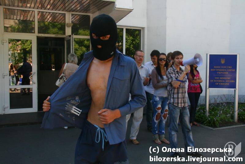 Хлопці тримали гасло "Бандити й міліція - одна коаліція". "Міліціонер", при шевроні і з чорною маскою на голові, розпахував поли блакитної сорочки, вдягненої на голе тіло (разоблачєніє!) - зсередини на сорочці були закріплені шприци - і пропонував усім купити в нього наркотики.