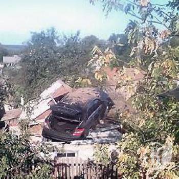 «Я проснулась от громыханья и сильной музыки, подумала: НЛО. Сразу выбежала на улицу, а тут авто на сарае висит. Это же хорошо, что нежилое сооружение пострадало, а если бы дом», – вытирает слезы хозяйка дома 70-летняя Надежда Пашко.