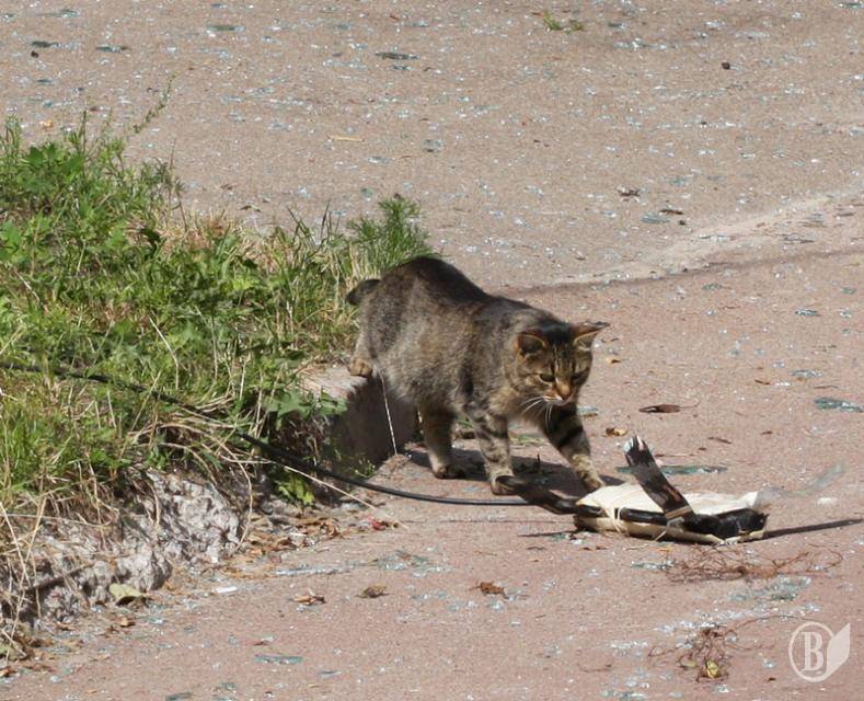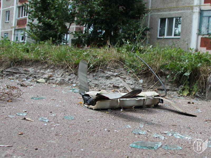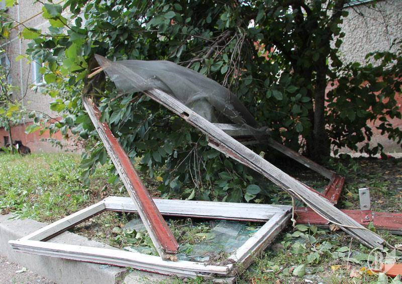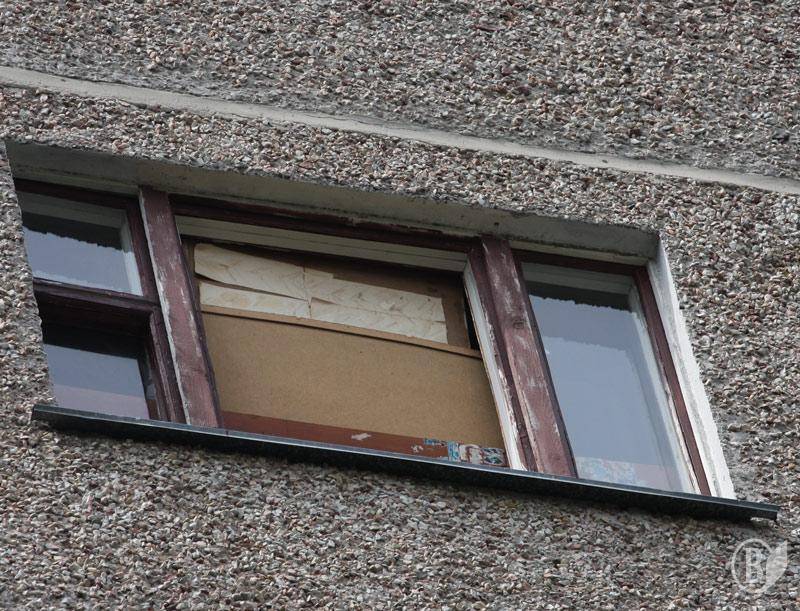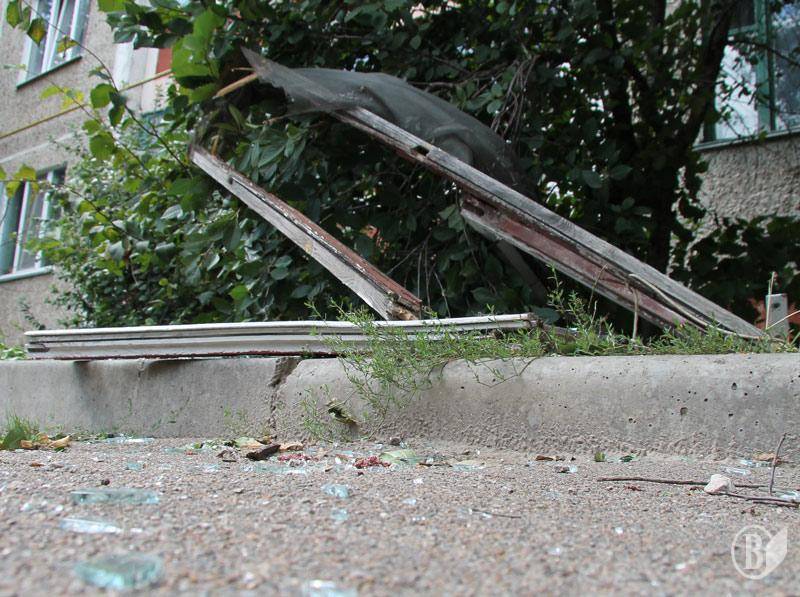 Картина на вулиці зараз спокійна. Тільки багато битого скла. Валяються розбита балконна рама, злив з балкону, телевізійна антена.