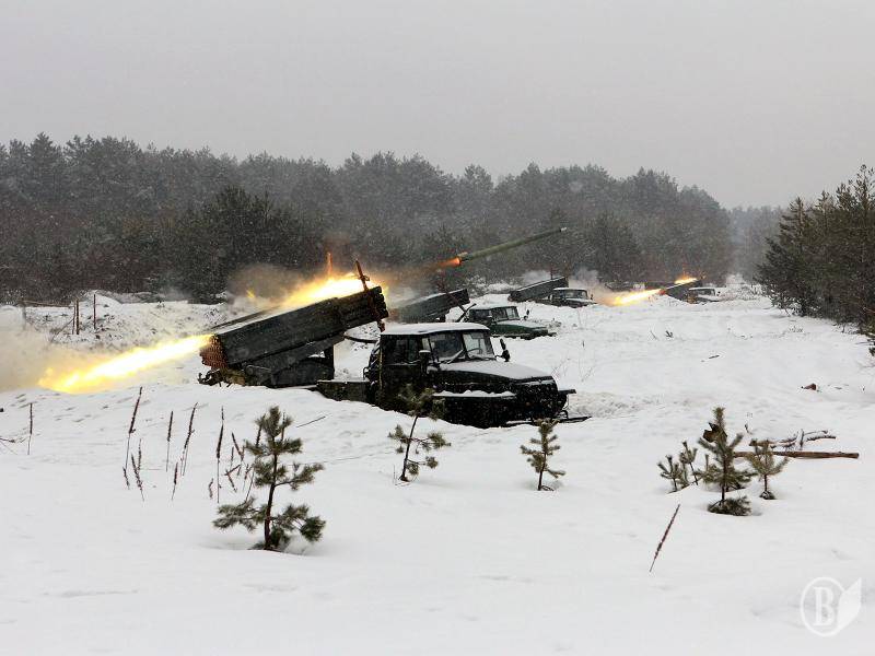 Бойові стрільби з систем залпового вогню БМ 21 “Град” проводять артилеристи реактивного артилерійського дивізіону 1-ї окремої танкової бригади на Гончарівському полігоні, що на Чернігівщині.