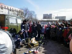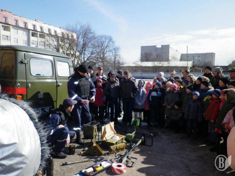 Далі співробітники групи піротехнічних робіт аварійно-рятувального загону спеціального призначення Чернігівської області вивезли небезпечний предмет з території школи для подальшого знешкодження. Кінологи показали дітям як їхні собаки чітко вміють виконувати різні команди, потім на території школи розгорнули своє спорядження піротехніки та змістовно пояснили дітям для яких конкретно завдань воно використовується.