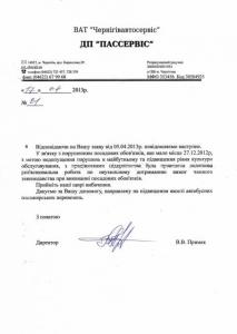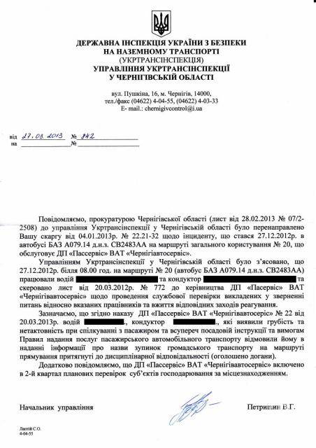 Оскільки водій і кондуктор проявили некомпетентність, низьку культуру спілкування, не забезпечили якісне обслуговування пасажирів на автобусному маршруті загального користування, а також порушили права передбачені Конституцією України та Законодавством про автомобільний транспорт, до Управління Укртрансінспекції у Чернігівській області було направлено заяву з проханням встановити, що то були за особи, а також призначити перевірку виконання ліцензійних умов провадження господарської діяльності ДП «ПАССЕРВІС» у місті Чернігів щодо надання послуг з перевезення пасажирів автомобільним транспортом.