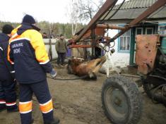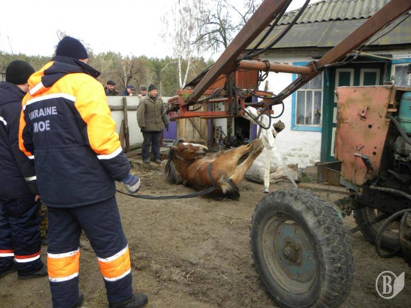 Спасатели, которые прибыли на место события из Чернигова, обвязали животного пожарными рукавами, потому что обычными бечевками можно травмировать животного, и с помощью трактора-подъемника освободили коня из ловушки.