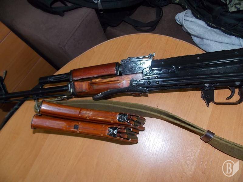 В ходе проведения работы с неизвестным, а именно осмотра его вещей, в сумке было обнаружено охотничье оружие АКМС–МФ с двумя снаряженными магазинами и запасными зарядами, всего 100 охотничьих зарядов, и устройство для отстрела резиновых пуль ПМР с двумя снаряженными магазинами и запасными зарядами всего 256 зарядов.