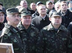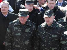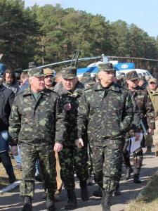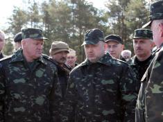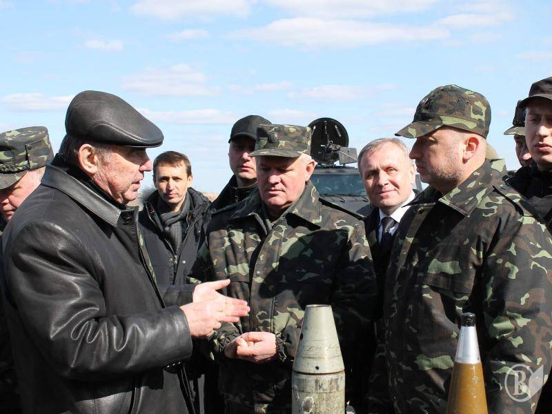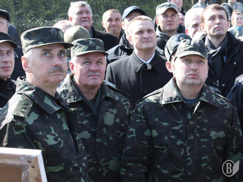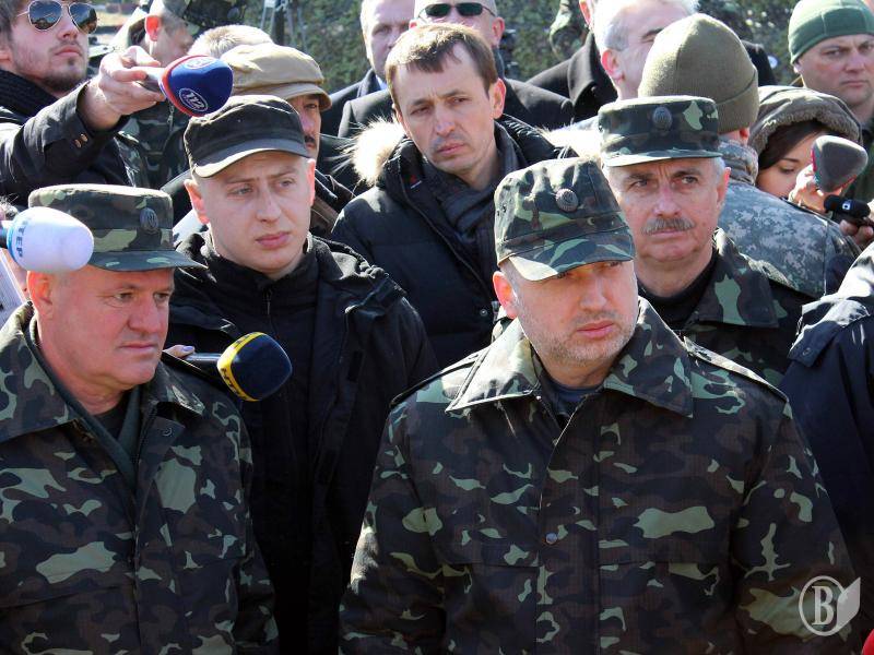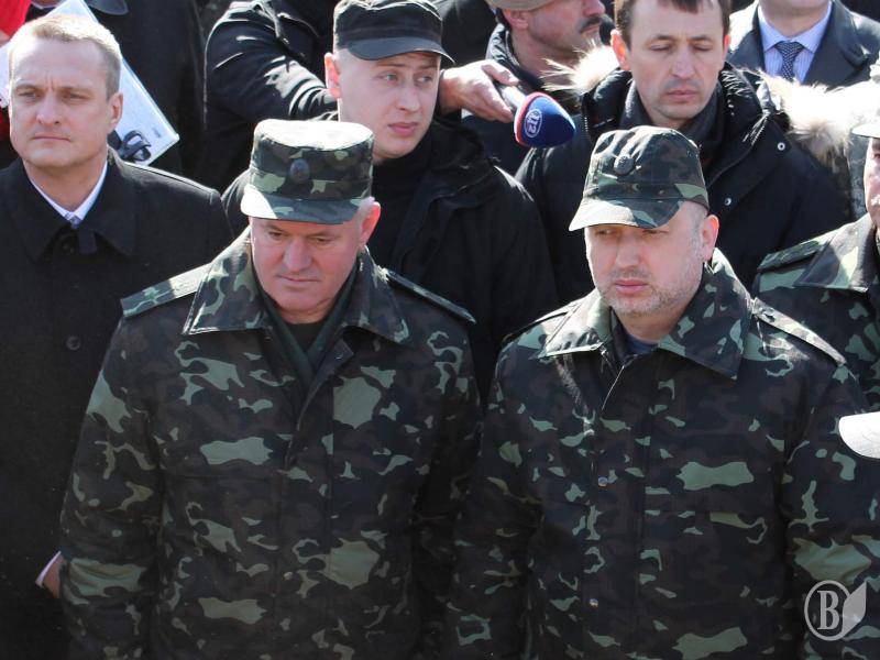 Александра Турчинова сопровождали временно исполняющий обязанности Главы Администрации Президента Украины Сергей Пашинский, исполняющий обязанности Министра обороны Украины генерал-полковник Михаил Коваль, начальник Генерального штаба, – Главнокомандующий Вооруженных Сил Украины генерал-лейтенант Михаил Куцин, временно исполняющий обязанности командующего Сухопутных войск Вооруженных Сил Украины генерал-лейтенант Анатолий Пушняков.