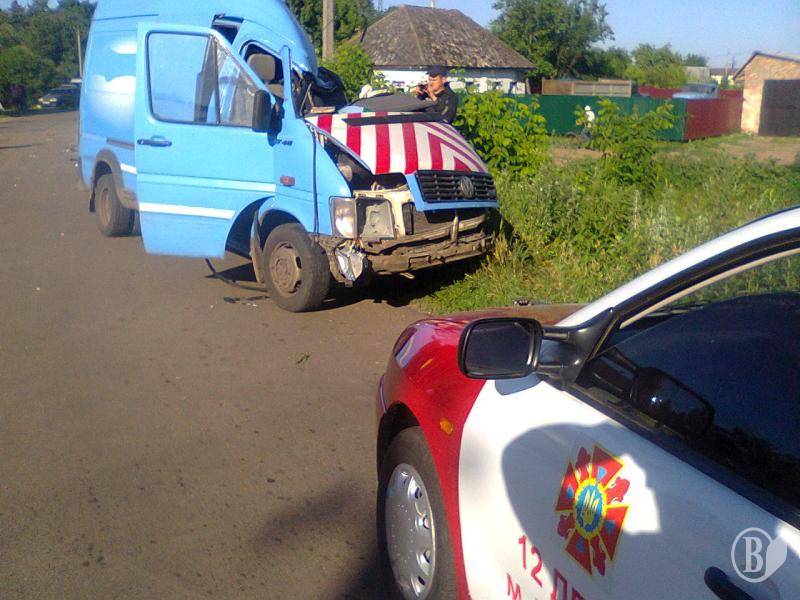 Автобус двигался по маршруту "Талалаевка - Киев". В результате столкновения 34-летнего водителя "Wolkswagen" зажало между сидением и панелью приборов, а 51-летний водитель и два пассажира автобуса "Эталон" получили телесные повреждения.