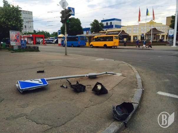 Черный джип Субару вчера вечером напротив Мсd не вписался в поворот, снес знак пешеходного перехода и разбил светофор.