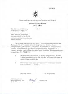 Виконком Новгород-Сіверської міської ради рішенням від 30.04.2014 р. відмінив своє ж рішення від 4.05.2006 р. «Про надання дозволу на проведення мітингів, зборів політичними та громадськими організаціями» як таке, що не відповідає нормам чинного законодавства.