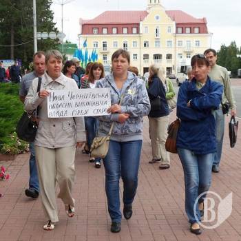 Під Чернігівською обласною державною адміністрацією чорнобильці вимагали припинити порушувати їхні права і закликали керівництво області піти у відставку