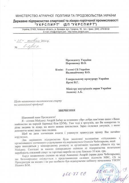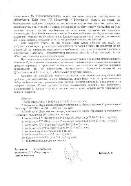 У своєму листі сотник Майдану наводить докази, які підтверджують незаконне виготовлення горілчаної продукції цими підприємствами, їх вплив на «Укрспирт» та реакцію правоохоронних відомств.