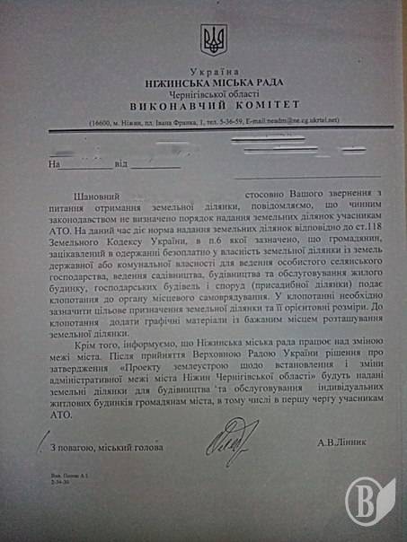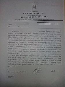 Инициированное же Черниговской облгосадминистрацией поручения относительно поддержки членов семей участников АТО в части освобождения их от уплаты за жилищно-коммунальные услуги на время проведения антитеррористической операции на востоке страны получило поддержку ряда райгосадминистраций и органов местного самоуправления. Лишь в этом списке почему-то нет Нежинского горсовета. Никаких решений о предоставлении льгот для участников АТО не принято и до сих пор.