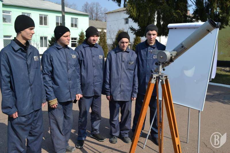 Осужденные юноши Прилуцкой воспитательной колонии, по инициативе опытного педагога учителя астрономии Виктора Куприя, вынесли телескоп прямо на центральную аллею учреждения – и несколько часов подряд наблюдали за солнечным затмением.