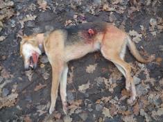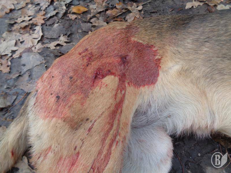 Наш пес был убит одной пулей вдогонку. В исходном отверстии вывернуты внутренности.